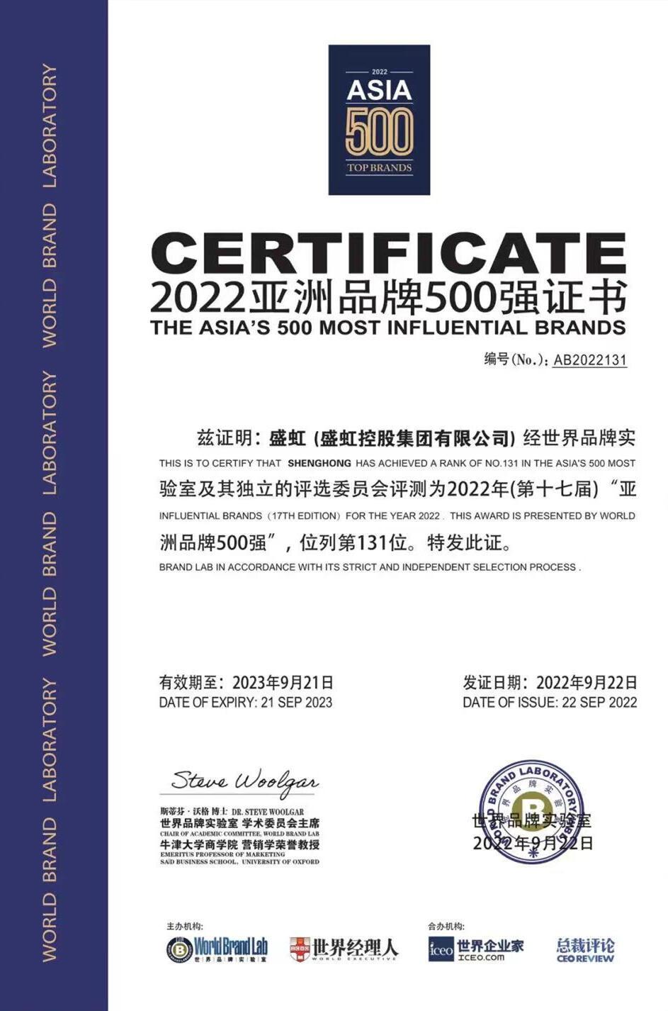 9月22日,世界品牌實驗室(World Brand Lab)發布2022年《亞洲品牌500強》排行榜,盛(shèng)虹控股集團連續第3年上榜,位列榜單第131位,較上年上升20位。